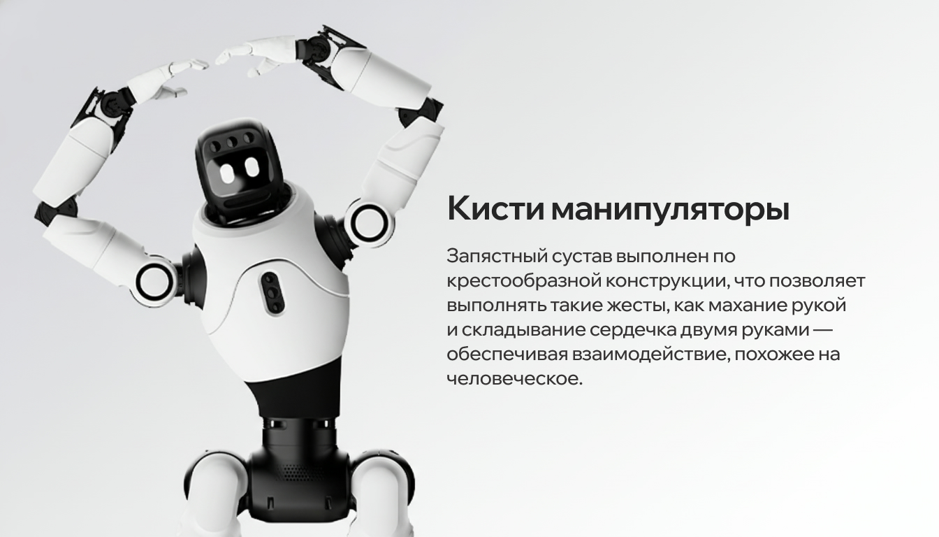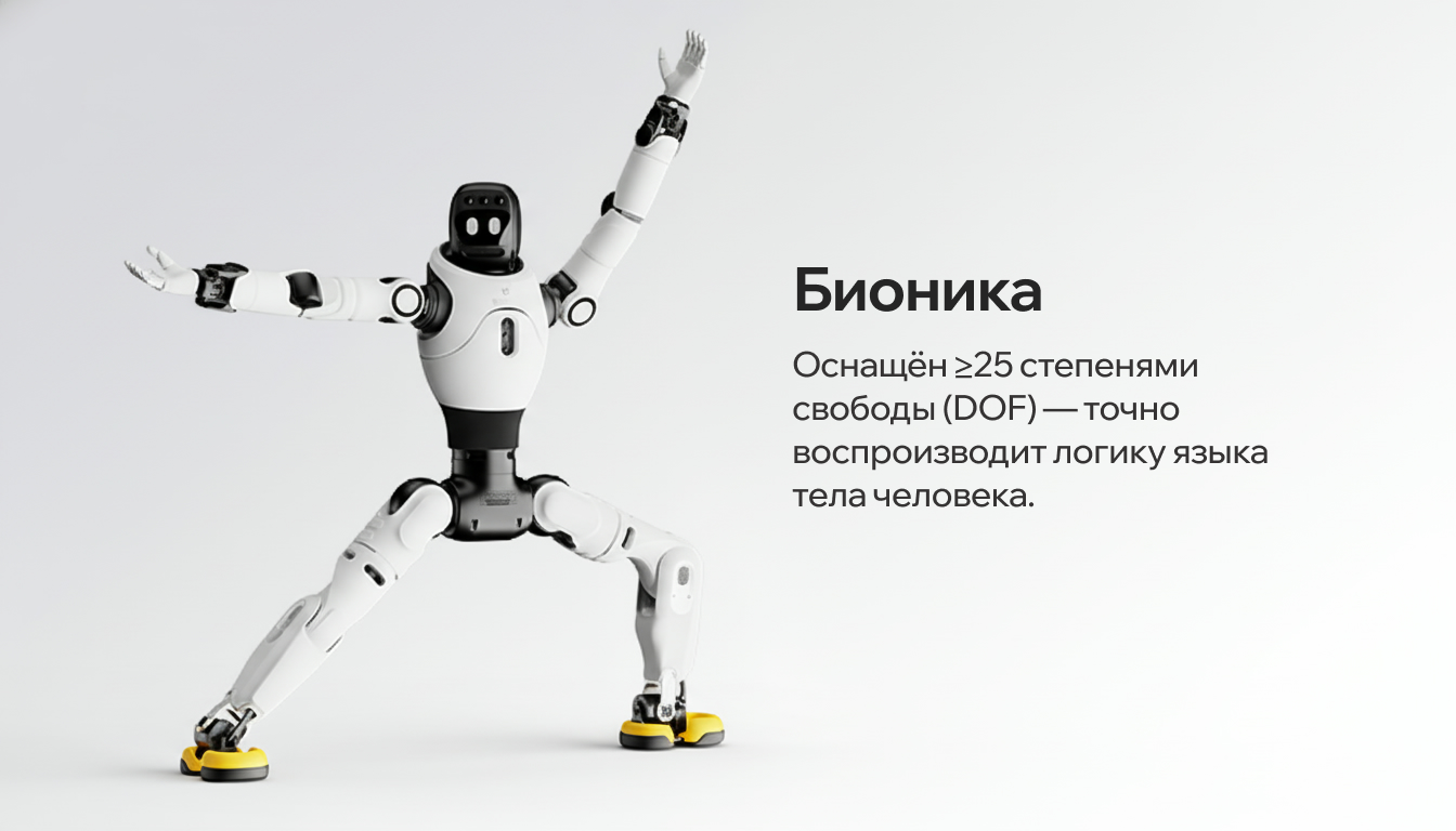 Робот имеет от 25 до 30 степеней свободы — в том числе 1 ось у головы и 3 у талии. Это делает движения разнообразными и плавными, придавая им живую, почти человеческую выразительность.